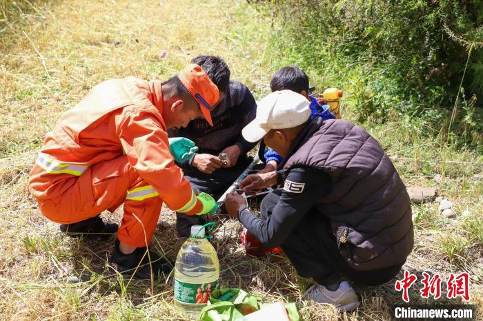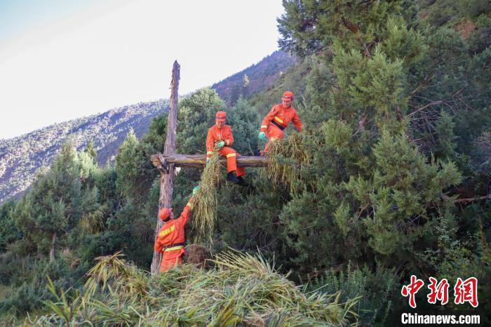 消防員將農(nóng)牧民的青稞掛到架子上晾曬,這是當?shù)氐膫鹘y(tǒng)青稞晾曬方式。劉星文 攝