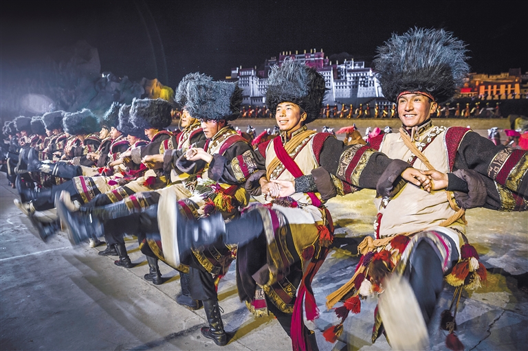 星空為幕,山川為景,氣勢恢宏,震撼心靈。直抵人心的音樂聲響起,歡快的果卓鼓聲震天,熱情的篝火升騰;打阿嘎的搗地之聲,古老藏戲的婉轉(zhuǎn)傳唱,甲諧的豪情奔放……恢弘的布達(dá)拉宮布景前,“文成公主”和“松贊干布”穿越千年而來,再現(xiàn)漢藏和美的動(dòng)人傳奇。