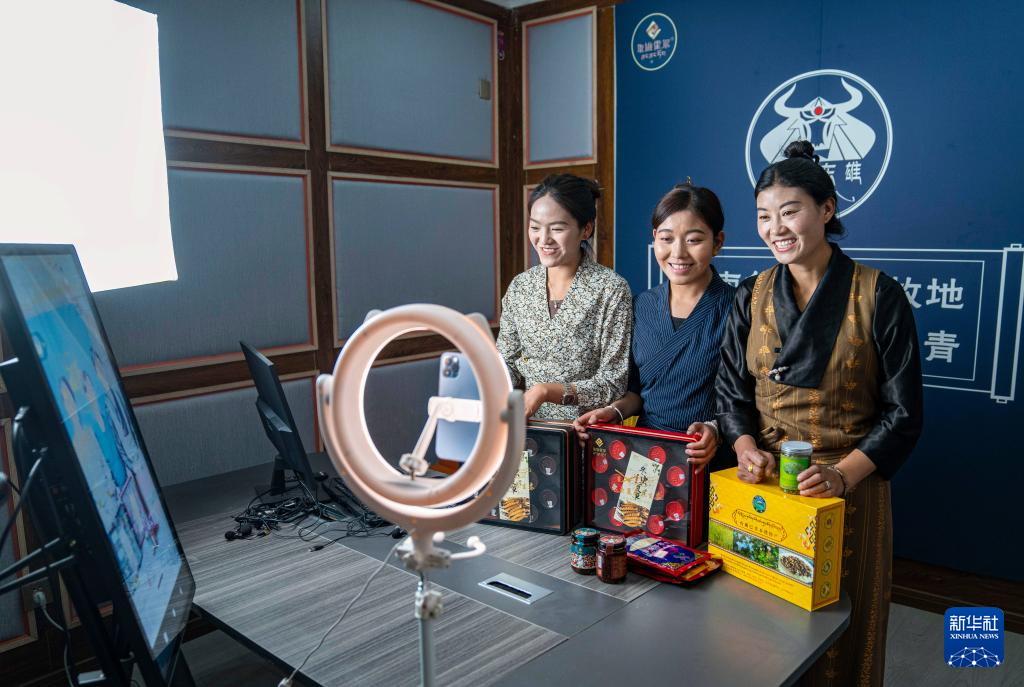 網(wǎng)絡(luò)主播在巴青縣“赤堆東雄”網(wǎng)紅直播間推介當(dāng)?shù)靥厣r(nóng)牧產(chǎn)品(10月29日攝)。新華社記者 孫非 攝