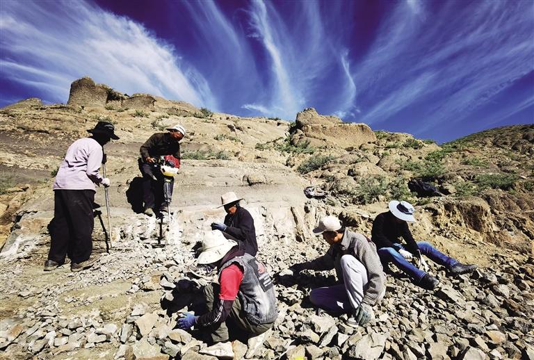 第二次青藏科考期間,中國(guó)科學(xué)院西雙版納熱帶植物園研究員蘇濤帶領(lǐng)的“生物與高原隆升協(xié)同演化”專題的科考分隊(duì),從2017年開始在拉孜開展了多次考察研究,在西藏自治區(qū)科考辦和當(dāng)?shù)卮迕竦膮f(xié)助下,最終在柳鄉(xiāng)發(fā)現(xiàn)了化石點(diǎn)并采集少量巖石樣品。