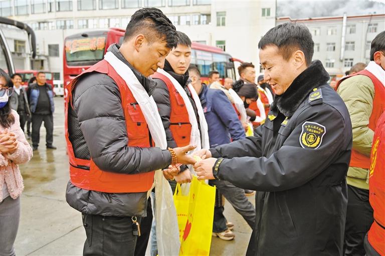 圖為啟動儀式現(xiàn)場,林芝市交通運輸局交通綜合行政執(zhí)法隊工作人員為返鄉(xiāng)農(nóng)民工送上小禮品。西藏日報記者 謝筱純 攝
