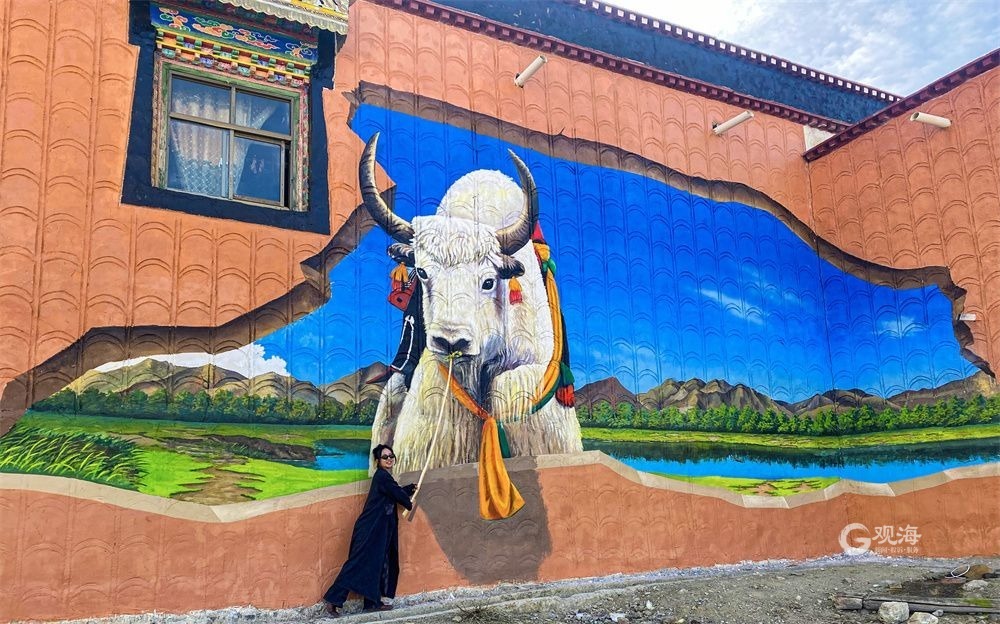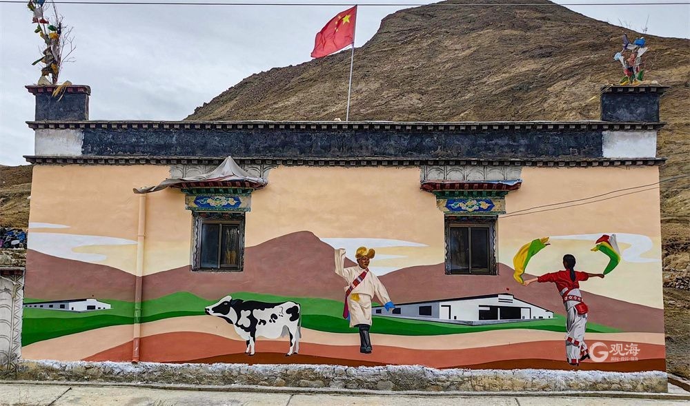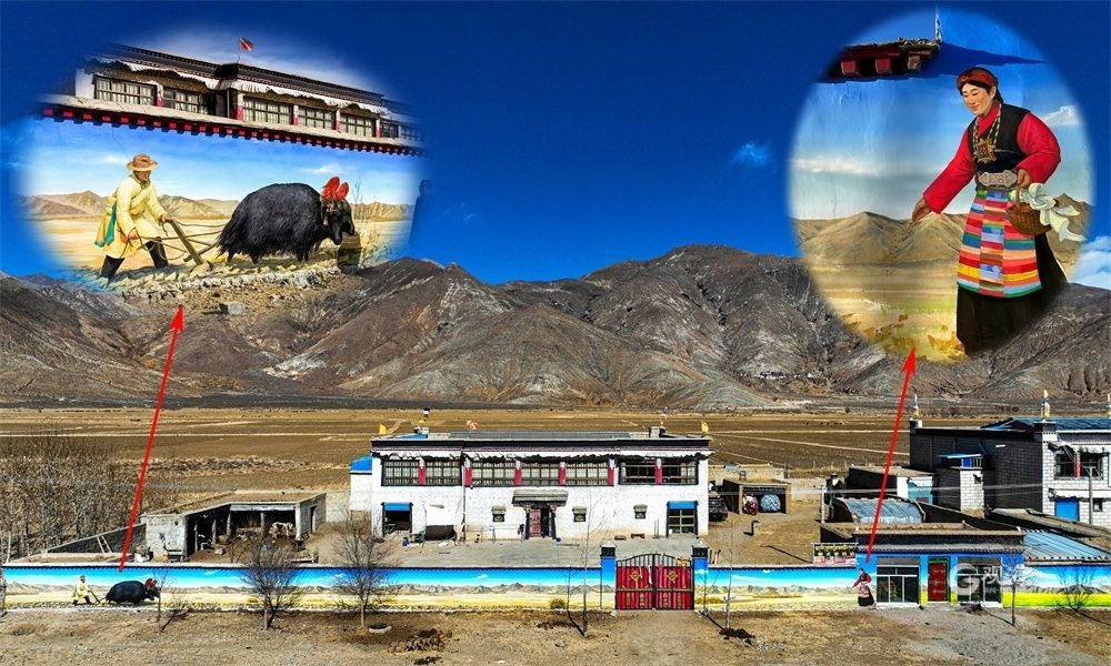 廣袤的高原上,在連綿起伏的山巒之下,是藏族農(nóng)家趕著傳統(tǒng)的“二牛抬杠”耕耘的場(chǎng)景,旁邊的“阿佳”則撒下希望的青稞種子……這樣的場(chǎng)景當(dāng)然不會(huì)出現(xiàn)在現(xiàn)在這個(gè)滴水成冰的季節(jié),而是躍然于藏家傳統(tǒng)村居的院墻之上?!拔壹疫@面墻原來就是貼滿了牛糞,現(xiàn)在畫上了我們平時(shí)勞動(dòng)的景象,感覺比之前更好看了。”桑珠孜區(qū)東嘎鄉(xiāng)色定村的村民旦瓊說,此前的一年又一年,他都是把牛糞貼在墻上,固然有傳統(tǒng)的高原美感,但是與現(xiàn)在院墻上畫的鄉(xiāng)村振興的場(chǎng)景相比,還是現(xiàn)在的感覺更不錯(cuò)。