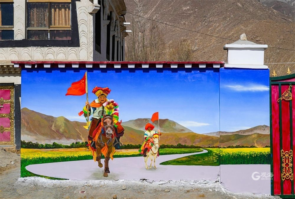鄉(xiāng)村振興、民族團(tuán)結(jié)、道路安全、移風(fēng)易俗、傳統(tǒng)文化、現(xiàn)代文明、高原特色……各式各樣的場(chǎng)景,現(xiàn)在已經(jīng)出現(xiàn)在了桑珠孜區(qū)東嘎鄉(xiāng)、聶日雄鄉(xiāng)、曲美鄉(xiāng)、納爾鄉(xiāng)部分鄉(xiāng)村的道路兩旁。一幅幅栩栩如生的手繪墻畫,“爬上”了錯(cuò)落有致的藏式小樓,“登上”了一座座藏式院落的院墻,成為一道道亮麗的風(fēng)景線。在干凈整潔的鄉(xiāng)村道路旁,錯(cuò)落有致的農(nóng)家庭院上,粉刷一新的墻面上色彩艷麗的大型墻繪以直觀的畫面和村民喜聞樂見的形式,將鄉(xiāng)村振興、民族團(tuán)結(jié)、移風(fēng)易俗等內(nèi)容與農(nóng)村景觀有機(jī)結(jié)合,讓一堵堵“牛糞墻”有了新活力吸引著過往路人的目光。一幅幅栩栩如生的畫面、一段段民族團(tuán)結(jié)的故事,與鄉(xiāng)村環(huán)境融為一體,形成了“村中有畫、畫中有村”的整體風(fēng)貌;一面面文明和諧、多彩絢麗的彩繪墻,猶如一張張靈動(dòng)的文明標(biāo)簽,將黨的方針政策、藏族同胞的幸福生活活靈活現(xiàn)地展示在墻上,不僅扮靚了鄉(xiāng)村美景,也傳遞了向上向善向美的正能量,處處都能讓人感受到美麗鄉(xiāng)村文明發(fā)展的濃郁氣息。