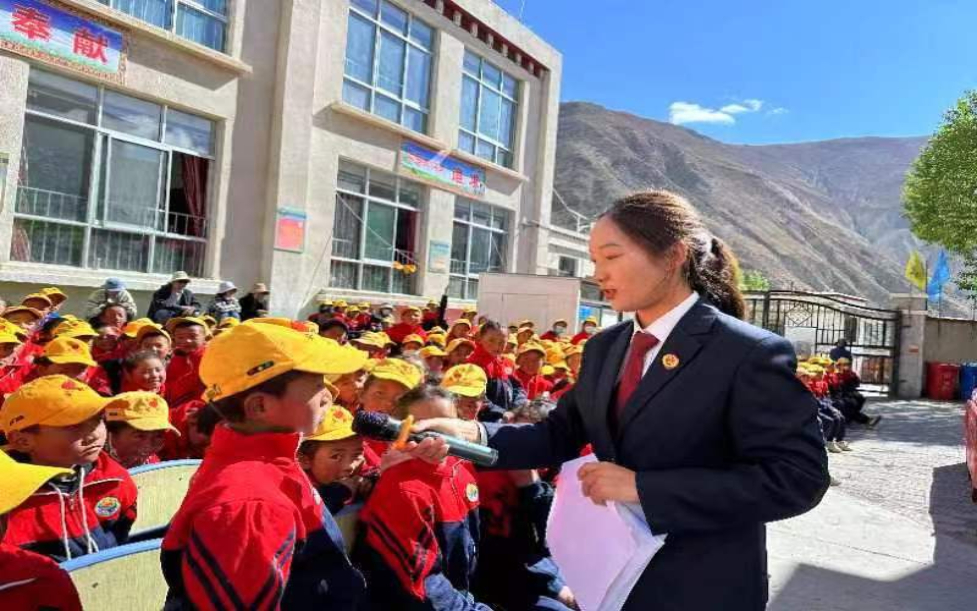 2023年“六一”國際兒童節(jié),尼木縣人民檢察院黨組書記、檢察長德吉桑姆帶領(lǐng)“文香·藍”法律宣傳服務(wù)隊前往帕古鄉(xiāng)完小開展法治進校園活動。