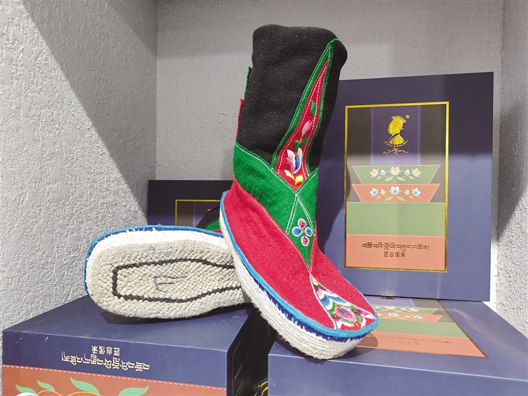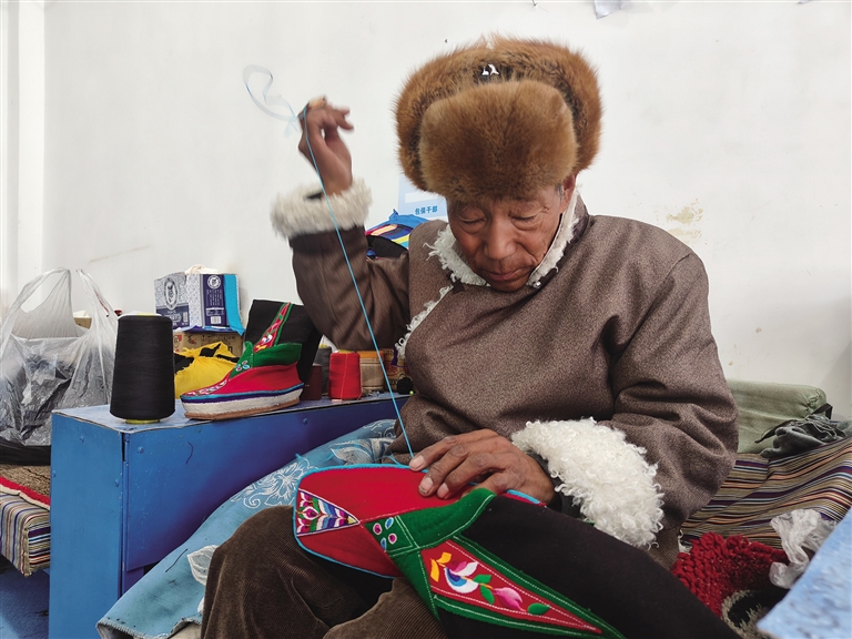“藏靴樣式精美、花色靚麗,因材質(zhì)和花色的不同分為‘郭扎’‘郭朵’‘松巴’三種?!枪?jié)慶時穿,‘郭朵’‘松巴’可以日常穿,制作一雙藏靴需要一周左右的時間。這些藏靴不分左右,磨損后可以互換,還可以防潮防寒?!闭诳p制藏靴的索朗頓珠雙手稍顯粗糲卻不失靈巧,他邊飛針走線,邊給記者介紹著手中的藏靴。厚而輕的鞋底、柔軟的靴面,五顏六色的絲線繡出栩栩如生的多瓣蓮花,加上氆氌制成的鞋面,一雙極具民族特色的藏靴展現(xiàn)在眼前。