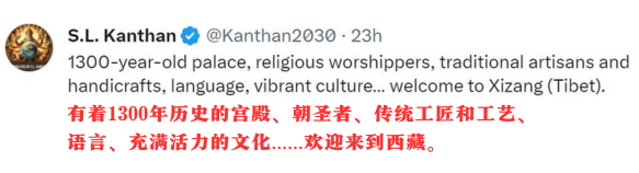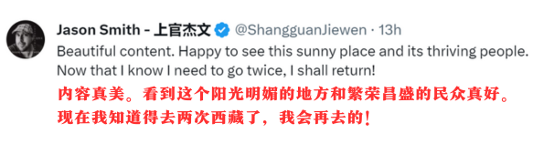 此外,新西蘭媒體人安柏然、《沙特阿拉伯新聞》記者賈邁勒·杜巴希、愛沙尼亞-中國商會主席達維德·維克托、美國反戰(zhàn)人士克里斯蒂·富蘭克林,我駐馬爾代夫大使館和駐意大利、英國、巴基斯坦外交官轉(zhuǎn)贊評,紛紛對西藏的美麗景色和深厚文化表示贊賞。