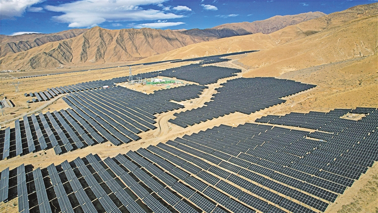 圖為瓊結(jié)縣白那村50兆瓦光伏儲能項(xiàng)目(無人機(jī)拍攝)。記者 旦增蘭澤 通訊員 倫珠澤仁 攝
