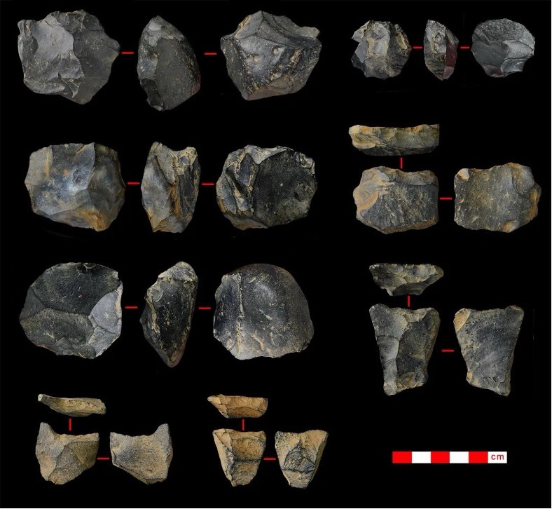 二號洞主探方T1發(fā)掘面積12平方米,已發(fā)掘至基巖,深度為2.2米。文化層底部距地表1.5米。主要文化遺存為石制品8136件、動物化石952件,此外還出土少量動物糞便和植物遺存。二號洞T1出土文化遺物主要是石核-石片技術(shù)生產(chǎn)的打制石器,原料以英安巖為主。石器組合完整,存在大量碎屑。石制品整體尺寸較小。單面向心剝片的小型盤狀石核獨具特色。石片形狀不規(guī)則。工具多以較厚的石片為毛坯,進行精致修理,刃緣較陡。器物類型豐富,包括刮削器、尖狀器、凹缺器、鉆器等。T1出土的動物化石破損風(fēng)化比較嚴(yán)重,但初步觀察仍發(fā)現(xiàn)有與人類利用動物資源相關(guān)的切割痕跡。綜合石制品、動物化石、地層和出土物產(chǎn)狀分析,這里應(yīng)為一處古人生活留下的原生堆積。根據(jù)初步的碳十四和光釋光測年結(jié)果,二號洞主文化層不晚于距今4.5萬年。