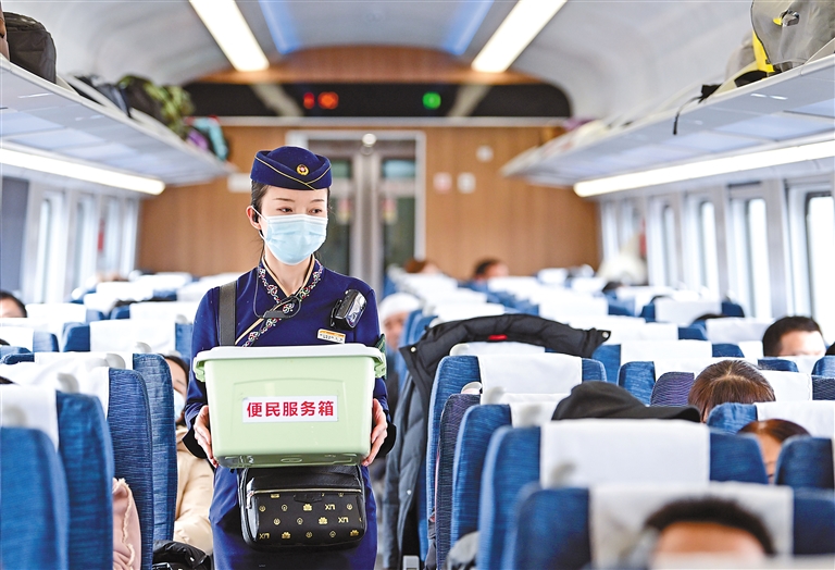 1月30日,中國(guó)鐵路青藏集團(tuán)有限公司西寧客運(yùn)段動(dòng)車隊(duì)乘務(wù)員王璐在為旅客服務(wù)。新華社記者 張龍 攝