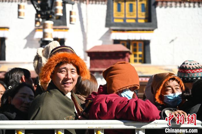 當日,去大昭寺朝佛祈福的隊伍已經排到了布達拉宮廣場附近。民眾攜幼扶老,帶著哈達,手捧酥油,進大昭寺朝拜,為家人、為眾生祈福禳災。中新社記者隨著隊伍也排隊進了大昭寺,長長的隊伍,時而寬松,時而擁擠。到達釋迦牟尼12歲等身像佛殿,信眾拋出寓意吉祥的哈達,雙手合十,默念經文。寺內僧人、消防員全員出動,疏導民眾,維持秩序。