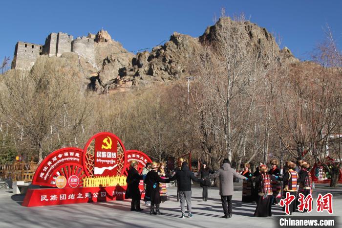 資料圖為援藏干部與民眾在瓊結(jié)民族團(tuán)結(jié)主題公園跳鍋莊舞。曲杰 供圖