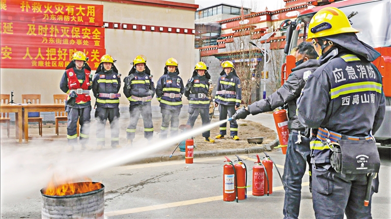 乃東區(qū)消防救援大隊來到乃東街道貢康社區(qū),組織駐村工作隊、網(wǎng)格員、群眾開展消防應(yīng)急演練,進一步提升群眾火災防范意識和應(yīng)急處置能力。圖為消防員正在指導群眾進行滅火實操。