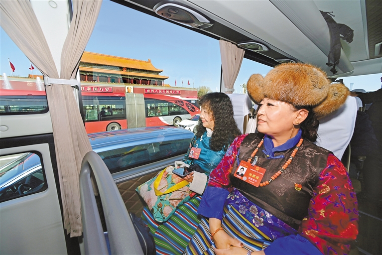 圖為人大代表們?cè)谇巴v地的途中經(jīng)過(guò)天安門。記者 旦增西旦 攝