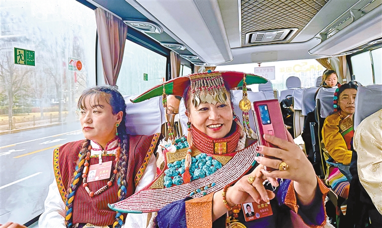 圖為全國人大代表格桑卓瑪乘車前往會(huì)場。記者 索朗群培 攝