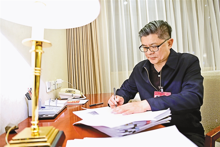 圖為全國人大代表王強(qiáng)在駐地整理發(fā)言材料。記者 旦增西旦 攝