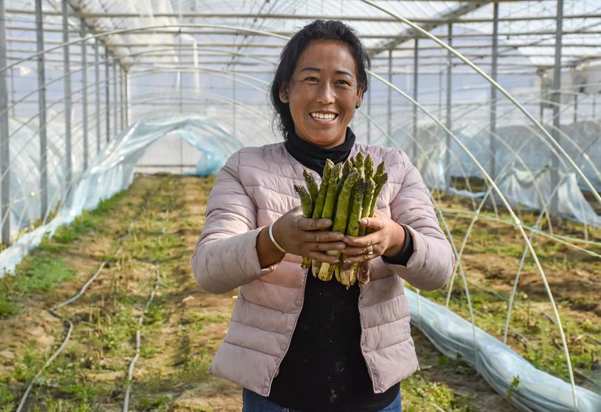 章達村村民次仁卓瑪展示高原有機蘆筍。劉楓攝