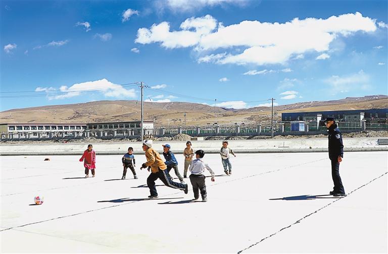 在結(jié)束執(zhí)勤,返回宿舍途中,里孜出入境邊防檢查站民警楊會強(qiáng)、盧帆忽聞一陣嬉笑。循聲看去,口岸邊貿(mào)市場停車場內(nèi),一群充滿活力的小朋友,正圍著一個(gè)破舊足球追趕。