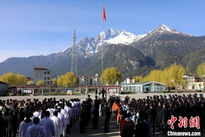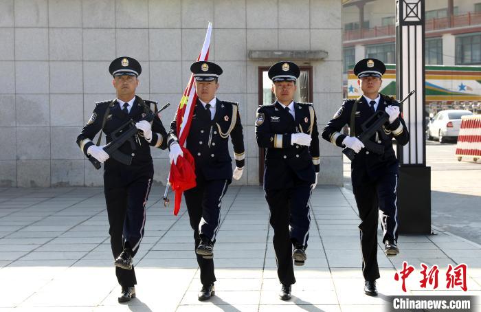 圖為吉隆出入境邊防檢查站移民管理警察將鮮艷的五星紅旗護送至升旗臺。肖富貴 攝