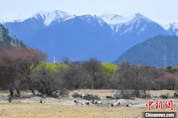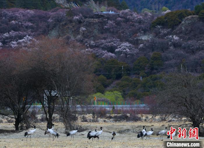 3月30日,在西藏林芝市巴宜區(qū)更章門巴民族鄉(xiāng)境內(nèi),黑頸鶴在村莊里、盛開的桃花前、雪山下翩翩起舞,形成一幅絕美的自然畫卷。黑頸鶴,被譽為“鳥類大熊貓”,是國家一級保護(hù)野生動物,也是世界上唯一在高原地區(qū)生長和繁殖的鶴類。近年來,西藏不斷加大黑頸鶴生存環(huán)境保護(hù)力度。據(jù)2022年冬季越冬黑頸鶴種群數(shù)量調(diào)查顯示,在西藏越冬的黑頸鶴種群數(shù)量達(dá)11175只,種群數(shù)量持續(xù)增長,并在西藏全區(qū)均有分布,其瀕危等級也從“易危”降為“近?!薄T诹种?,黑頸鶴在桃花與雪山間自由翱翔,展現(xiàn)了人與自然和諧共處的美好場景。