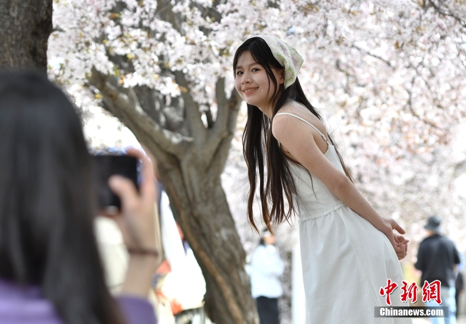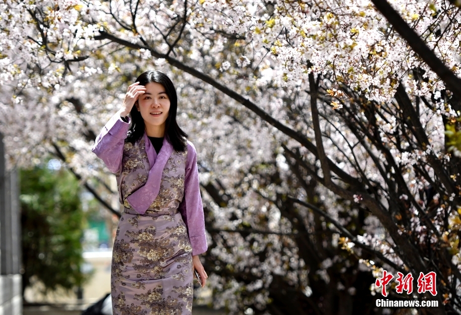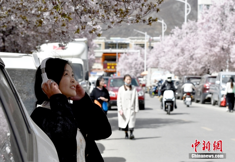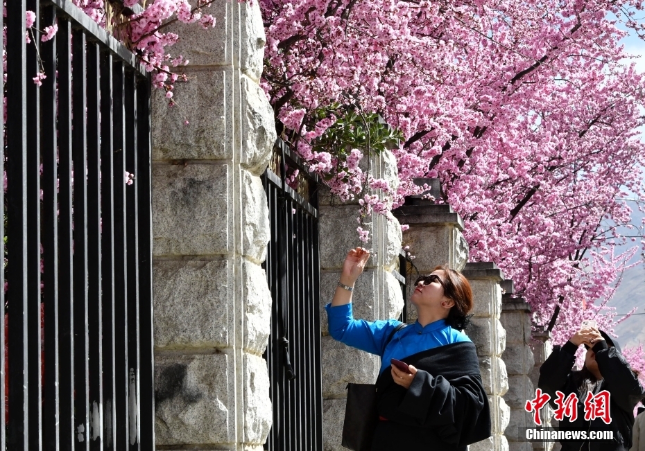 4月1日,市民在春花綻放的道路旁賞花。隨著雪域高原天氣回暖,西藏拉薩市區(qū)各條道路春花綻放。因道路兩側繁華似錦,拉薩市城關區(qū)軍民路成網(wǎng)紅打卡地,市民游客紛紛前來打卡拍照。中新社記者 李林 攝