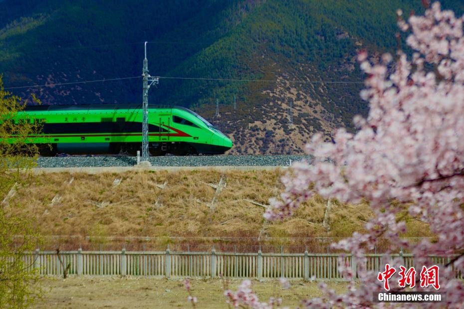 被譽為新“天路”的拉林鐵路,是中國首條高原電氣化鐵路,于2021年6月25日開通運營,結束了西藏東南地區(qū)不通鐵路的歷史。圖為拉林鐵路沿線桃花盛開,與飛馳而過的動車構成別樣風景圖。馬生明 攝