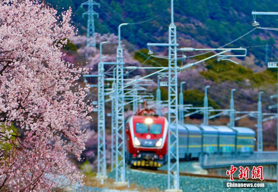 圖為拉林鐵路沿線桃花盛開,列車飛馳而過。四朗卓嘎 攝