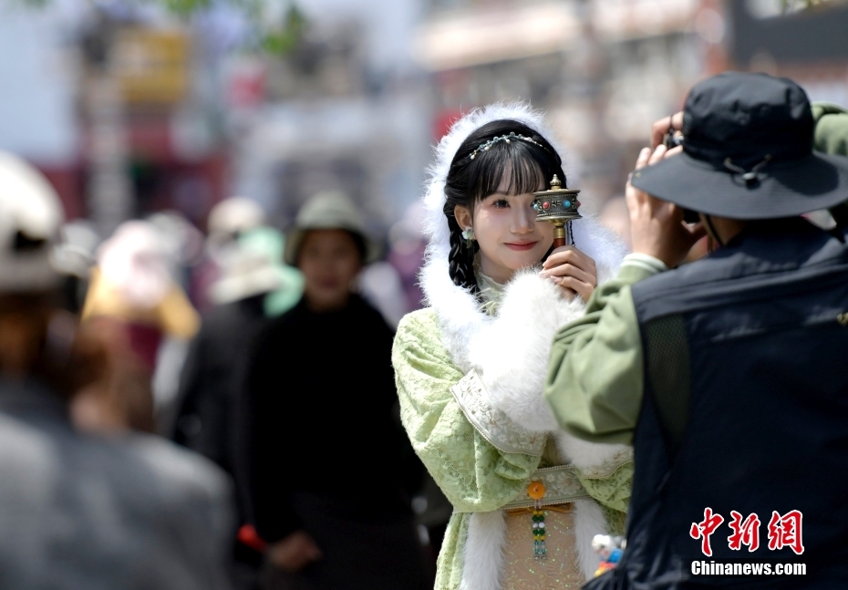 4月23日,身著藏裝的游客在拉薩八廓街拍照留念。隨著西藏旅游旺季臨近,中外游客來到雪域高原觀光旅游。中新社記者 李林 攝