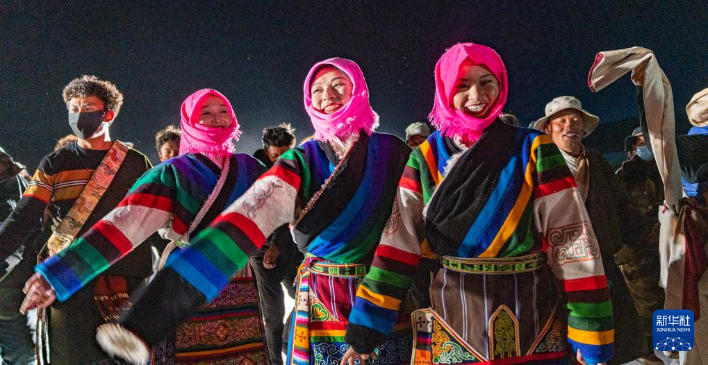 當(dāng)?shù)厝罕娫诩{木錯開湖篝火晚會現(xiàn)場跳鍋莊(5月18日攝)。新華社記者 丁增尼達(dá) 攝