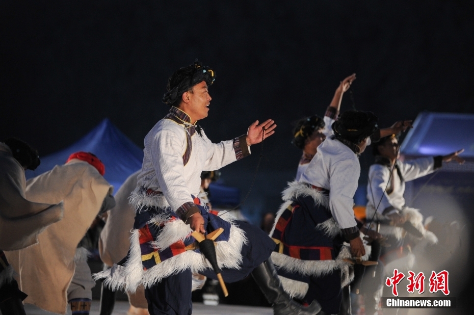5月18日晚,西藏拉薩市當(dāng)雄縣納木錯湖畔,當(dāng)?shù)啬撩駧в慰腕w驗篝火鍋莊舞。納木錯,被譽為“天湖”,吸引著大量游客前來觀光。圖為篝火鍋莊舞晚會上的文藝演出。