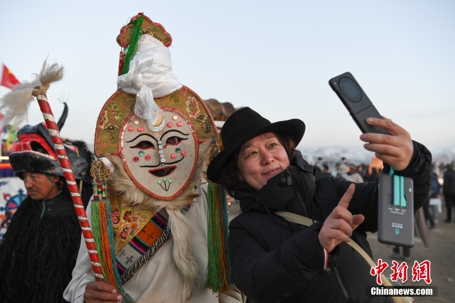 5月18日晚,西藏拉薩市當(dāng)雄縣納木錯湖畔,當(dāng)?shù)啬撩駧в慰腕w驗篝火鍋莊舞。納木錯,被譽為“天湖”,吸引著大量游客前來觀光。圖為游客跟演職人員合影。