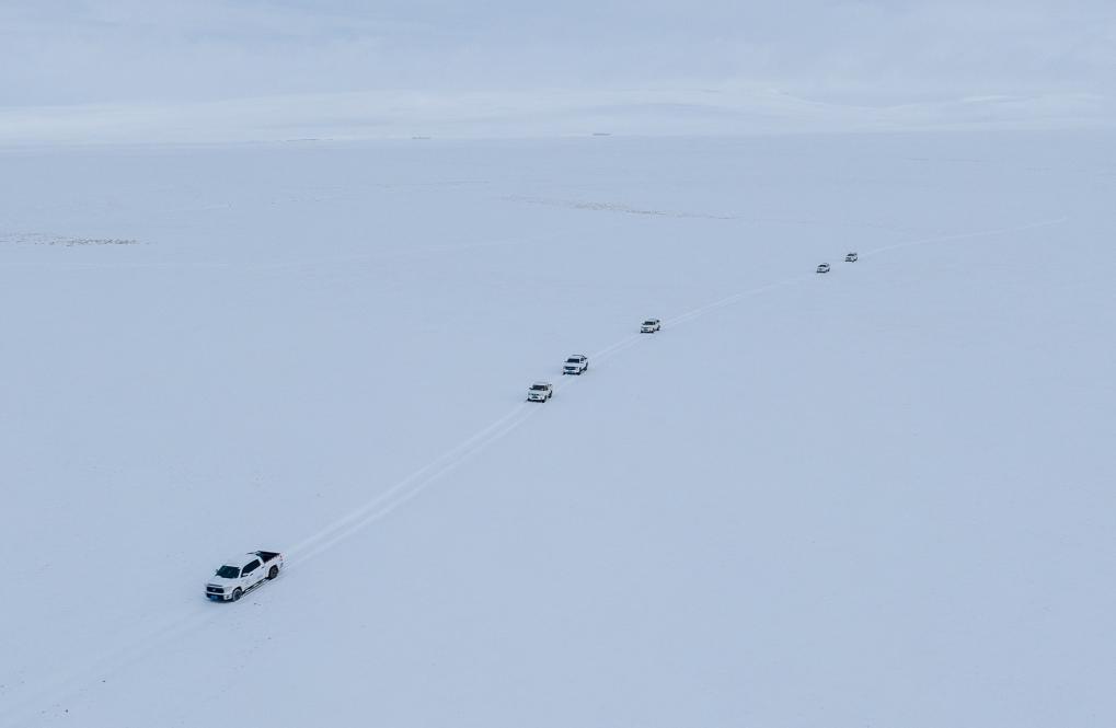野生動物專業(yè)管護(hù)隊員的車隊在大雪中巡護(hù)(無人機(jī)照片,5月8日攝)。新華社記者 丁增尼達(dá) 攝