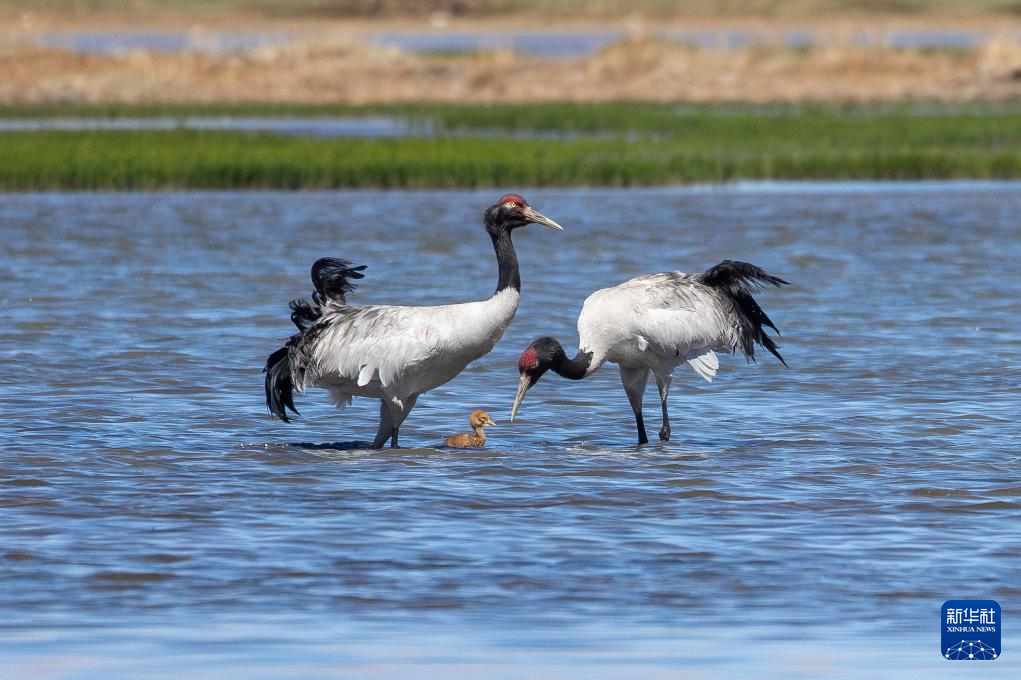6月9日,黑頸鶴帶著雛鳥(niǎo)在西藏那曲市申扎縣一處濕地棲息、覓食。新華社記者 旦增尼瑪曲珠 攝