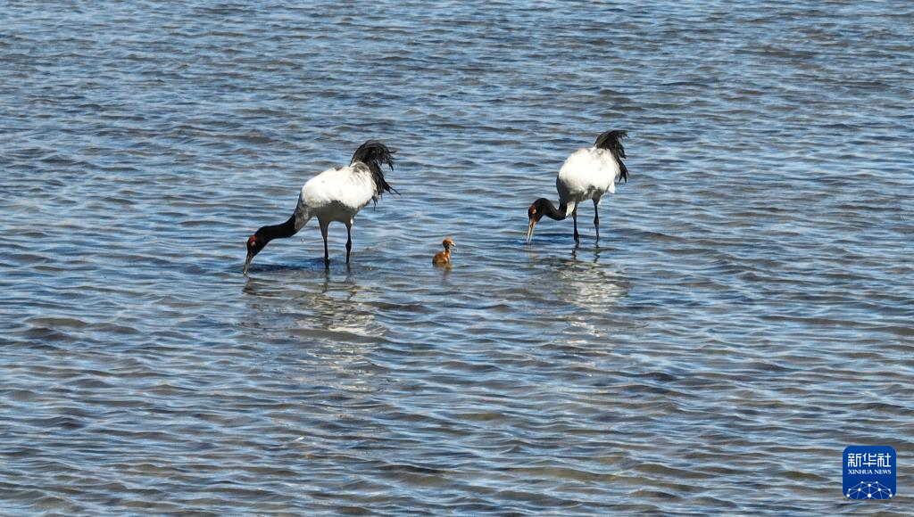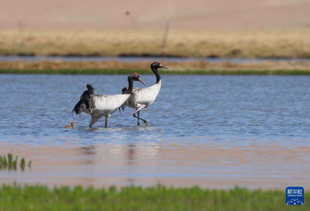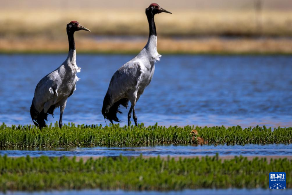 6月9日,黑頸鶴帶著雛鳥(niǎo)在西藏那曲市申扎縣一處濕地棲息、覓食。新華社記者 晉美多吉 攝