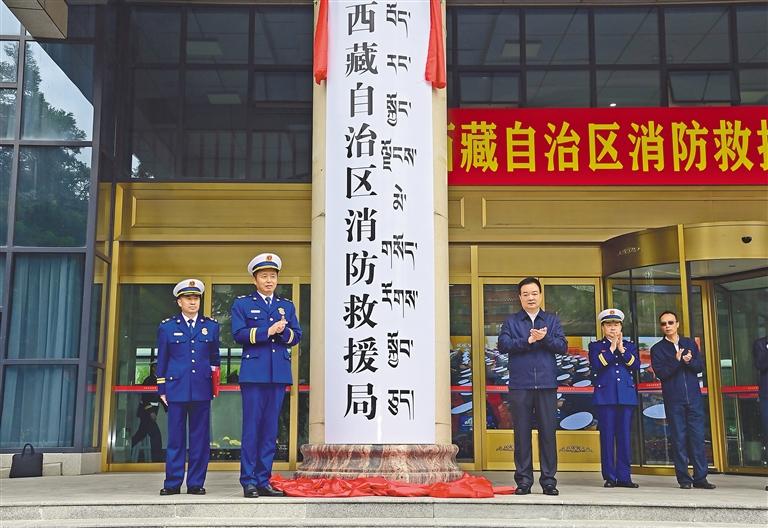 6月18日上午,自治區(qū)黨委書記王君正前往自治區(qū)消防救援總隊(duì)調(diào)研。這是王君正為西藏自治區(qū)消防救援局揭牌。本報記者 旦增西旦 攝