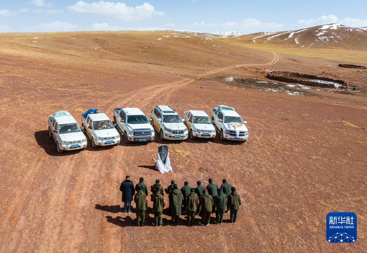 野生動物專業(yè)管護(hù)隊(duì)員們在無人區(qū)深處的羅布玉杰烈士紀(jì)念碑前默哀致敬(無人機(jī)照片,5月10日攝)。 新華社記者 姜帆 攝