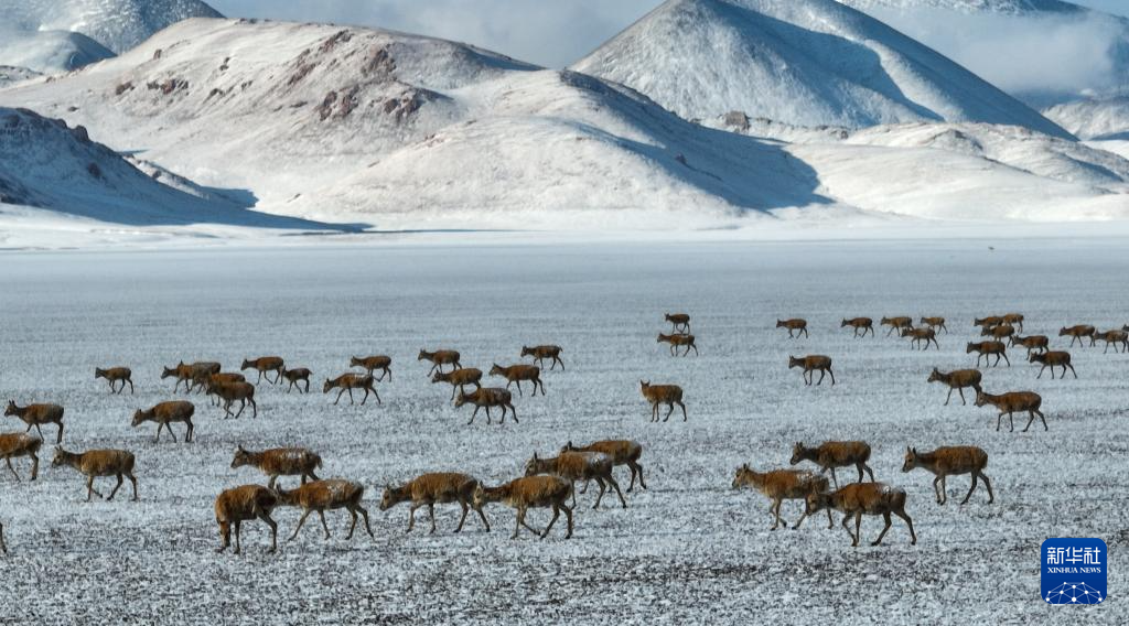 這是在甜水河畔荒灘雪地中向產(chǎn)羔地遷徙的藏羚羊(6月15日攝 無人機(jī)照片)。新華社記者 晉美多吉 攝