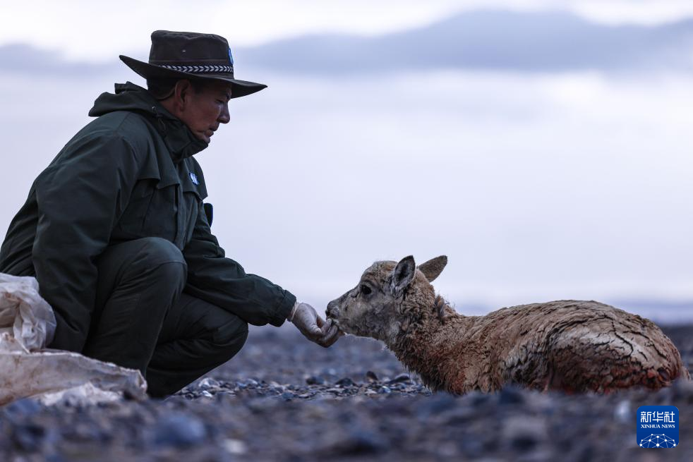 羌塘國家級自然保護(hù)區(qū)的野生動物專業(yè)管護(hù)隊(duì)員在安撫受傷的藏羚羊(6月13日攝)。新華社發(fā) 旦增 攝