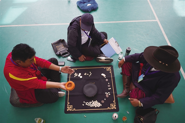 當(dāng)日,“吉韌”“秀茲”等項(xiàng)目一同開(kāi)賽?! 凹g”也叫藏式克郎球,是藏族的一種彈指運(yùn)動(dòng)。比賽在一張邊長(zhǎng)約1米的正方形木桌球臺(tái)上進(jìn)行,球臺(tái)四角有4個(gè)小洞,黑、白兩種扁圓形球子各9個(gè),另有1個(gè)紅色球子放置在球臺(tái)中心,1個(gè)白色母球供雙方彈擊球子所用。