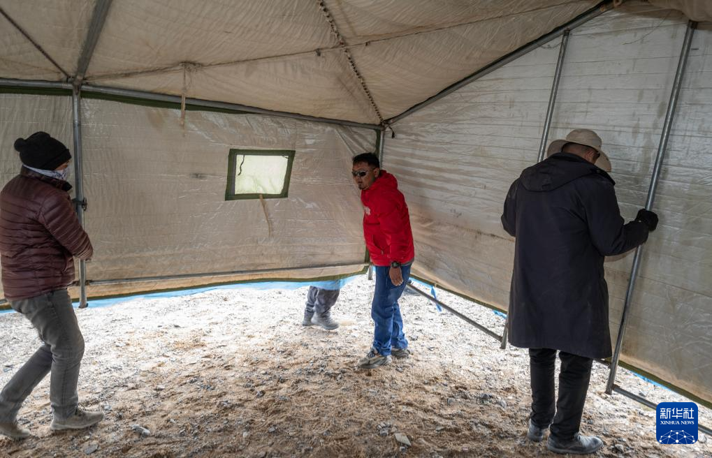 6月13日,格桑倫珠(中)、管護(hù)隊員和記者一起搭帳篷。新華社記者 費(fèi)茂華 攝