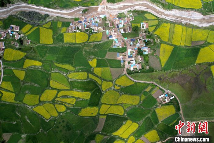 盛夏,西藏墨竹工卡油菜花盛放,一片金黃,風光宜人。油菜花與綠油油的青稞地以及藏式民居,共同繪就鄉(xiāng)村美麗畫卷。圖為7月10日,拉薩市墨竹工卡縣油菜花盛放。(無人機照片)中新社記者 李林 攝