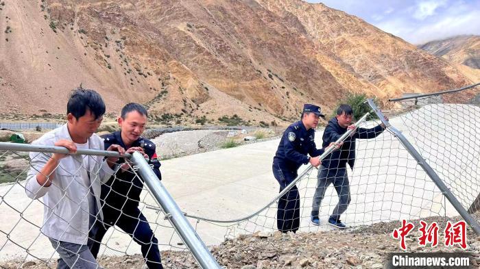 圖為普蘭邊檢民警與邊民搶修道路沿線防護欄。鐘悅祺 攝