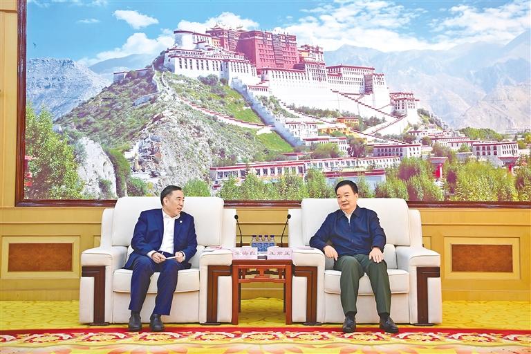 22日上午,自治區(qū)黨委書記王君正在拉薩與中國能建集團(tuán)董事長宋海良率隊(duì)的赴藏考察團(tuán)座談。