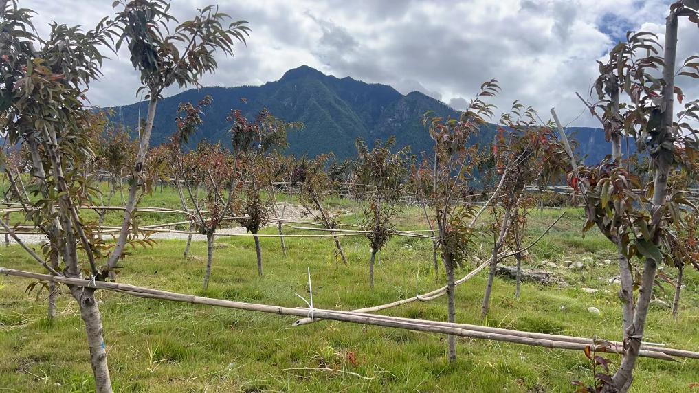 9月6日,在西藏林芝市巴宜區(qū)林芝鎮(zhèn)嘎拉村村外的同一片河灘上,植被覆蓋黃沙,桃樹枝葉漸長(zhǎng)。(尼瑪曲吉 攝)