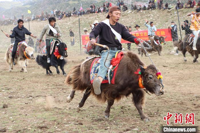 賽牦?;顒蝇F(xiàn)場,牧民將自家的牦牛精心打扮,信心滿滿地走上起跑線,一聲令響,眾騎手驅(qū)牛疾馳。現(xiàn)場呼聲陣陣,高潮迭起,為每一頭疾馳的牦牛加油歡呼。