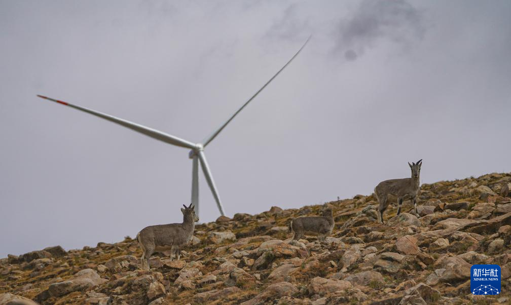 10月17日拍攝的位于西藏日喀則市薩迦縣的風(fēng)力發(fā)電機(jī)組及周圍山上的野生動(dòng)物。新華社記者 晉美多吉 攝??