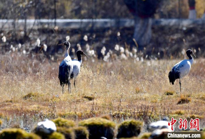 圖為11月3日,黑頸鶴在西藏拉薩達孜區(qū)棲息。中新社記者 李林 攝