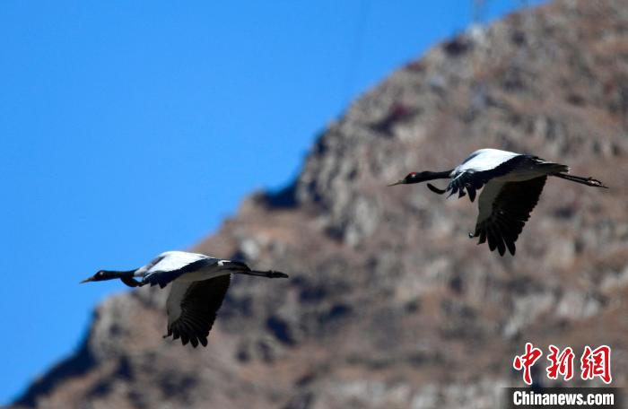 圖為11月3日,黑頸鶴在西藏拉薩達孜區(qū)上空飛翔。中新社記者 李林 攝