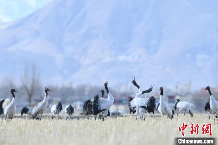 圖為拉薩林周縣黑頸鶴保護(hù)區(qū)內(nèi),黑頸鶴正在覓食、嬉戲。貢嘎來(lái)松 攝