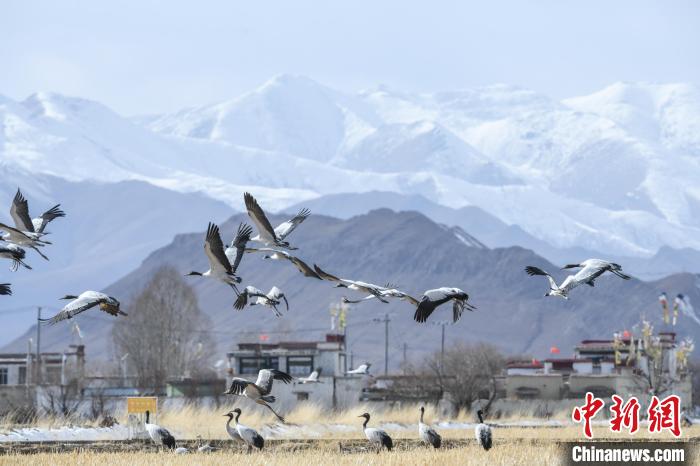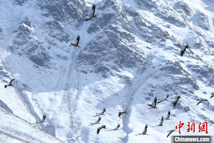 圖為拉薩林周縣黑頸鶴保護(hù)區(qū)內(nèi),黑頸鶴在雪山翱翔。貢嘎來(lái)松 攝