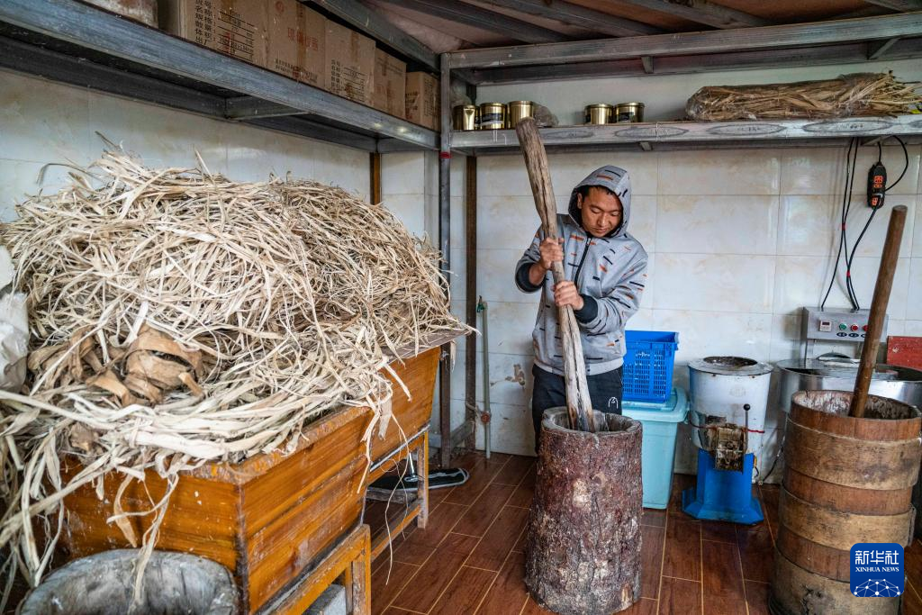在西藏米林市羌納鄉(xiāng)西嘎門巴村,南迦巴瓦童螺嘎布工藝品農(nóng)民專業(yè)合作社的工作人員正在制作藏紙(7月26日攝)。新華社記者 孫非 攝 ??